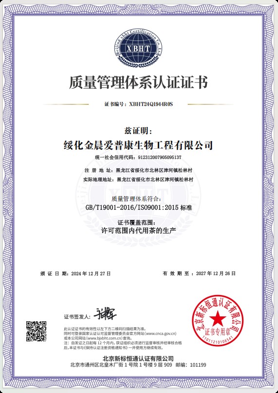 綏化金晨愛普康生物工程有限公司位于黑龍江省中南部地區(qū)的綏化市北林區(qū),所處位置東經124度,北緯45度,位于松嫩平原的呼蘭河流域,“有寒地黑土,塞北江南”的美譽,是全國重要的商品糧基地,屬中溫帶大陸性季風氣候,四季分明,雨熱同期,冬季冰雪覆蓋,夏季降雨集中氣候溫熱濕潤。綏化金晨愛普康生物工程有限公司是一家專業(yè)從事健康養(yǎng)生產品研發(fā)、生產及銷售企業(yè),公司占地總面積8000平方米,建筑面積5000平方米,公司周圍無任何污染源,是食品生產基地。公司生產車間潔凈度級別達到10萬級,同時擁有數十臺先進的生產設備及高科技檢驗儀器,從產品的原輔料、中間品、成品到銷售的全過程嚴格把關,使生產中每道工序都符合產品的高標準要求,從而保證了公司生產的每一袋產品合格,無質量缺陷。綏化金晨愛普康生物工程有限公司率先采用了企業(yè)資源ERP管理系統(tǒng),肩負著養(yǎng)生產業(yè)的重要課題,同時又是江蘇省國家藥用植物重點實驗中心科研成果轉化的生產試驗基地,公司核心成員均為本科以上學歷。生產的產品有近五十個品種的代用茶產品,公司先后通過HALAL國際認證,編號為SSPY-201318-33849;ISO9001質量管理體系認證編號為XBH···